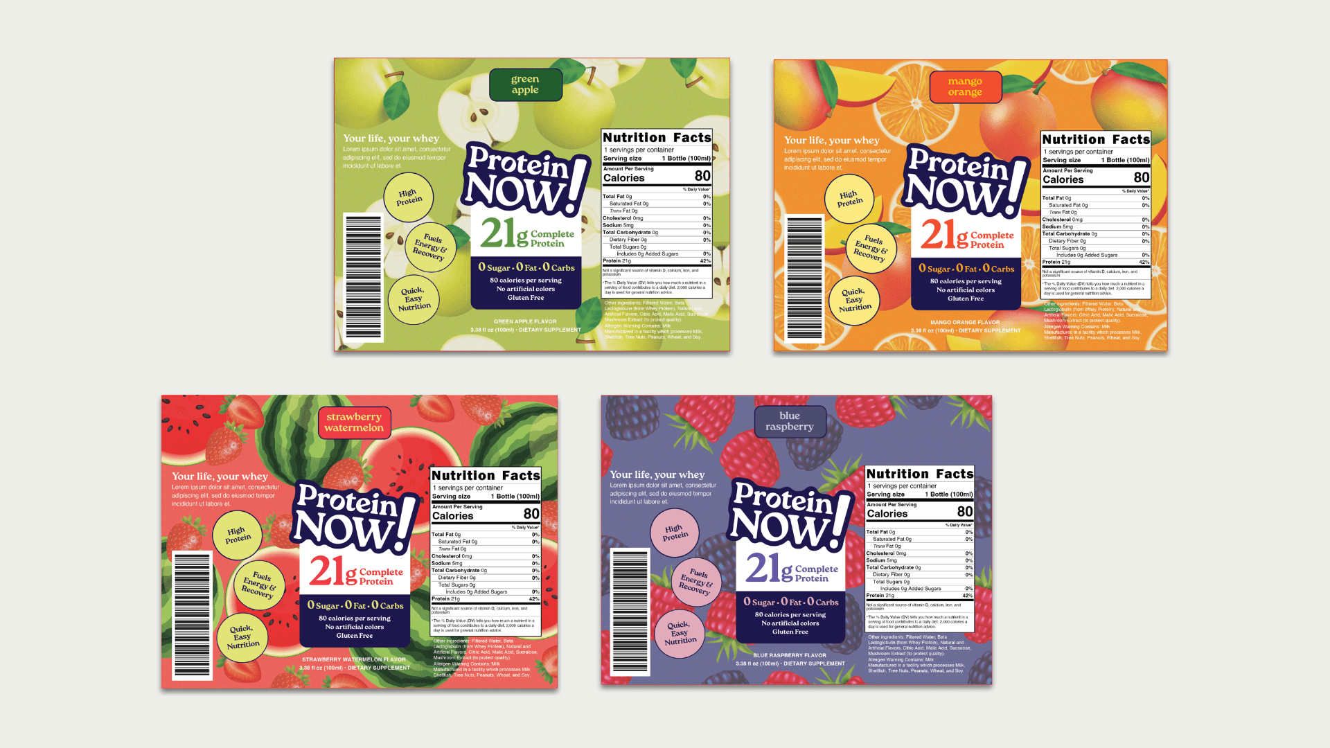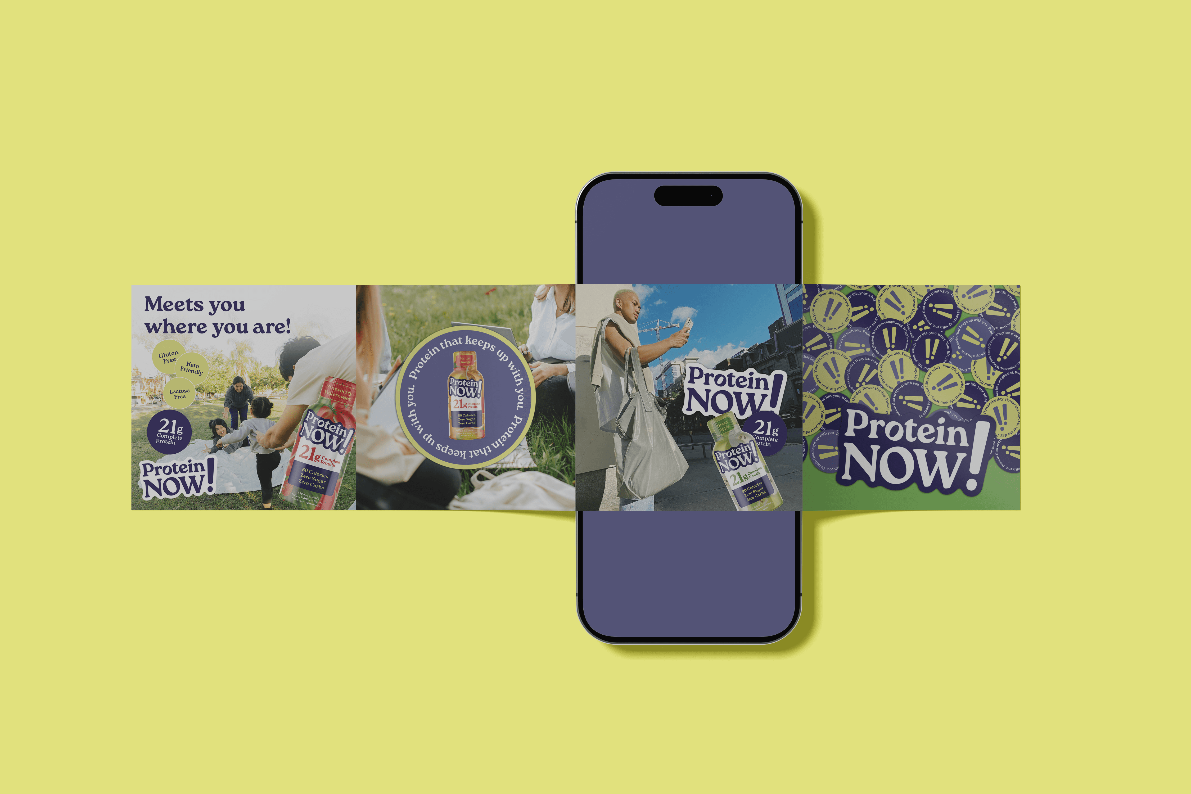 That translated into a wordmark where “Now” takes prominence in a soft, confident serif, punctuated by an oversized exclamation point to reinforce energy without aggression. A palette of deep purples paired with a warm, sunlit yellow balances strength with approachability, creating a tone that feels both capable and inviting. Packaging extends this through full-wrap fruit textures that add freshness and tactility, while sticker-style logo applications and recurring exclamation motifs bring flexibility and a sense of lightness across touchpoints. The result is a system that feels immediate, expressive, and broadly accessible—designed to meet users wherever they are.